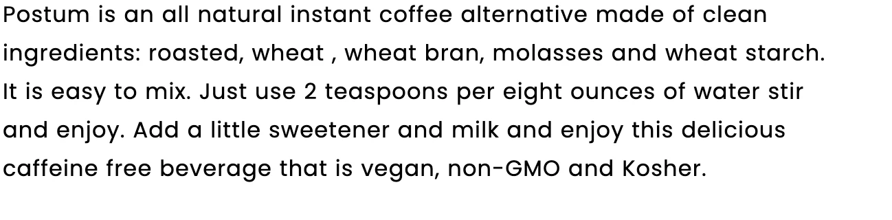 Postum® is the perfect family alternative to coffee and other caffeinated beverages. It's rich savory roasted flavor is similar to coffee, but with none of the caffeine, acidity or bitterness. We use a healthful blend of ingredients to create a wonderful drink that the whole family can enjoy- anytime!